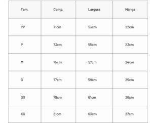Tabela de tamanhos: