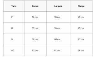 Tabela de tamanhos: